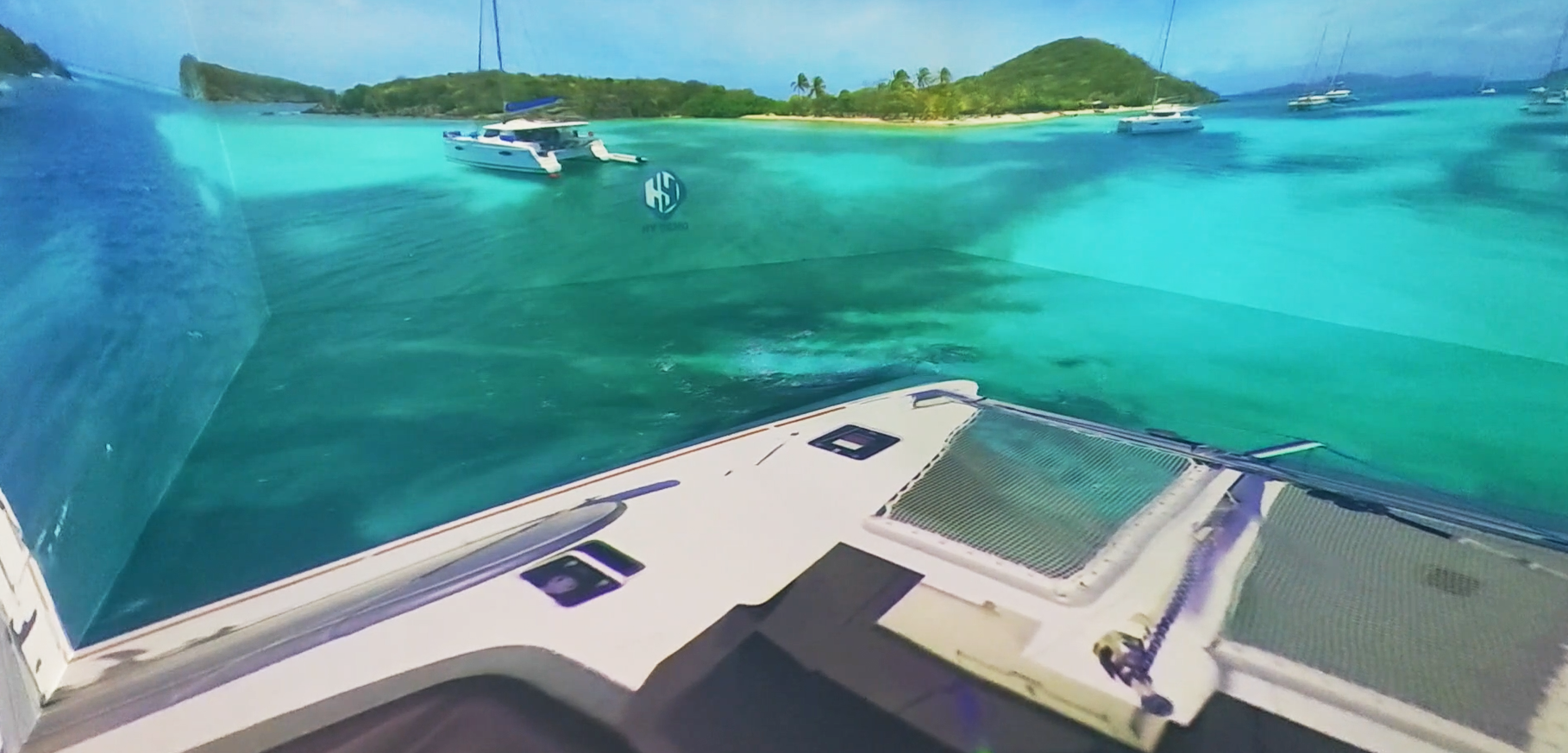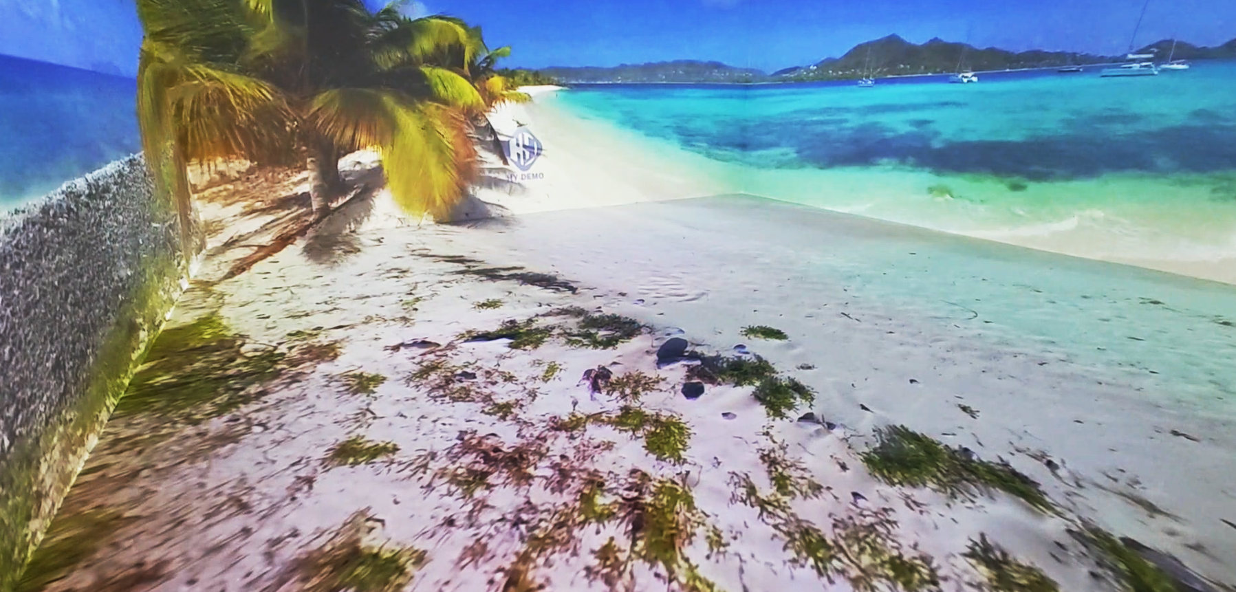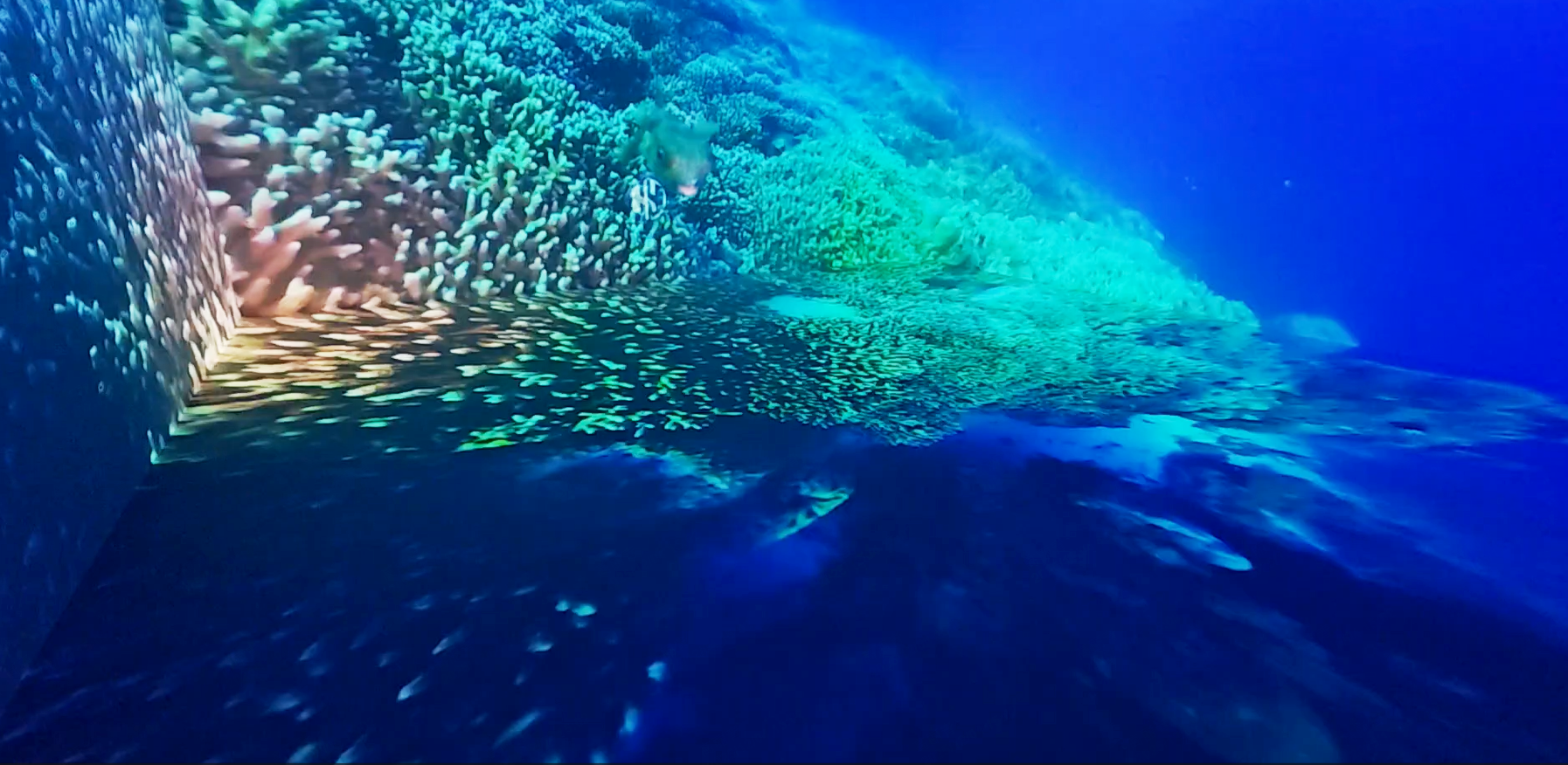 切換至海底秘境,地面鋪展著熒光珊瑚叢,細碎魚群隨腳步輕擺,墻面礁巖與珊瑚群無縫銜接,連珊瑚的紋理都在投影機的高清投射下清晰可見,仿佛一腳踏入深藍海底,轉瞬間又跳轉為海上游艇;地面化作澄澈漸變的海面,墻面映出白帆游艇與綠意海島;腳邊