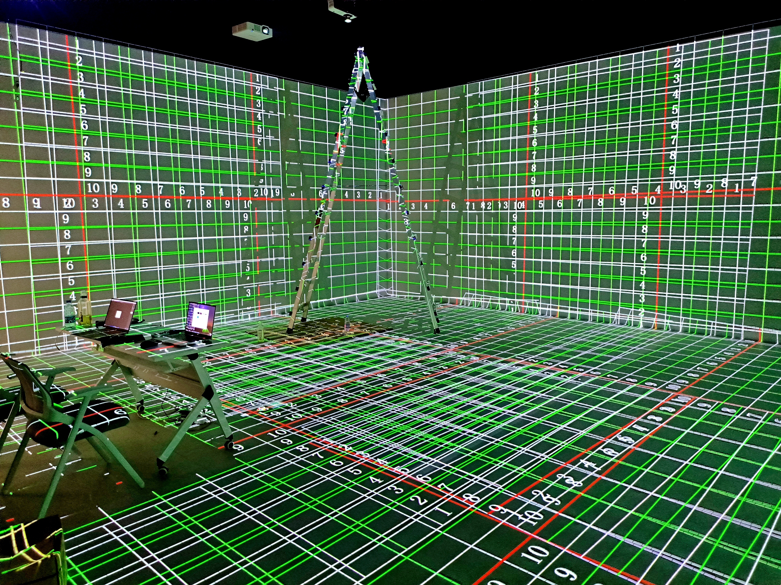 要實現(xiàn)墻面 + 地面的全域投影,12 臺設備的畫面拼接是核心難點。HT-L752UA 的精準融合能力,讓調(diào)試時的 “網(wǎng)格校準” (圖中綠色定位線)